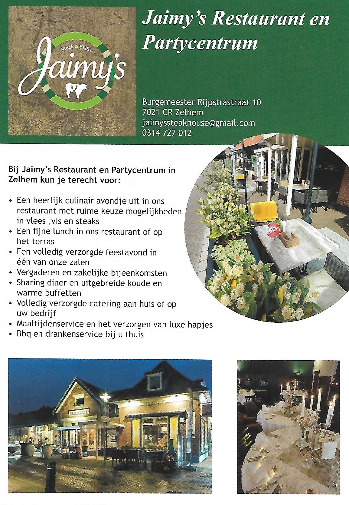 Uit Eten bij Jaimy’s te Zelhem Dit jaar houden ons etentje bij restaurant Jaimy’s in Zelhem. Een perfecte gelegenheid om gezellig bij te praten, herinneringen op te halen